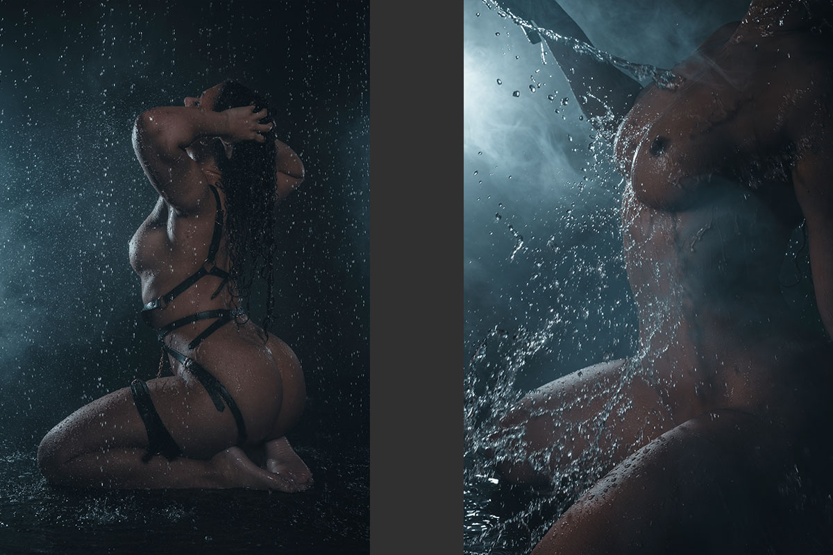 Viele denken das ist alles nicht echt... – DOCH – alles real. Ich kann es in meinem Studio regnen lassen und es macht riesen Spaß. So ein Regenshooting kann man so ca. 1,5 bis 2,5 Std. machen, danach ist das Wasser ausgekühlt. Das ganze kann man noch mit Schaum und Nebel kombinieren. Meine Zinkwanne erfreut sich auch immer größerer Beliebtheit. Das Set hierfür ist auch sehr variabel. Viele wollen aus der Wanne gar nicht wieder raus. Ich sollte vielleicht Wellness-Shootings anbieten. Desweiteren habe ich noch die Möglichkeit in einem kleinen Schwimmbad Fotos zu machen. Die Kosten hierfür immer nur auf Anfrage.