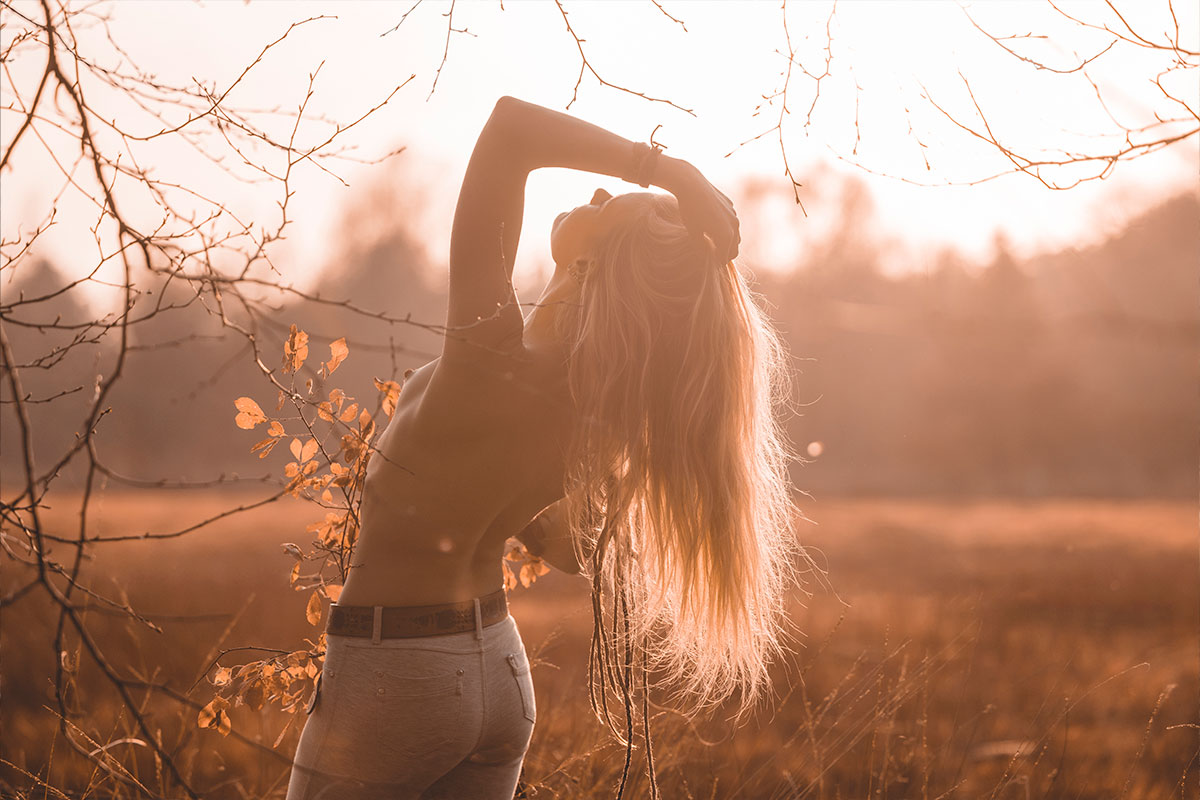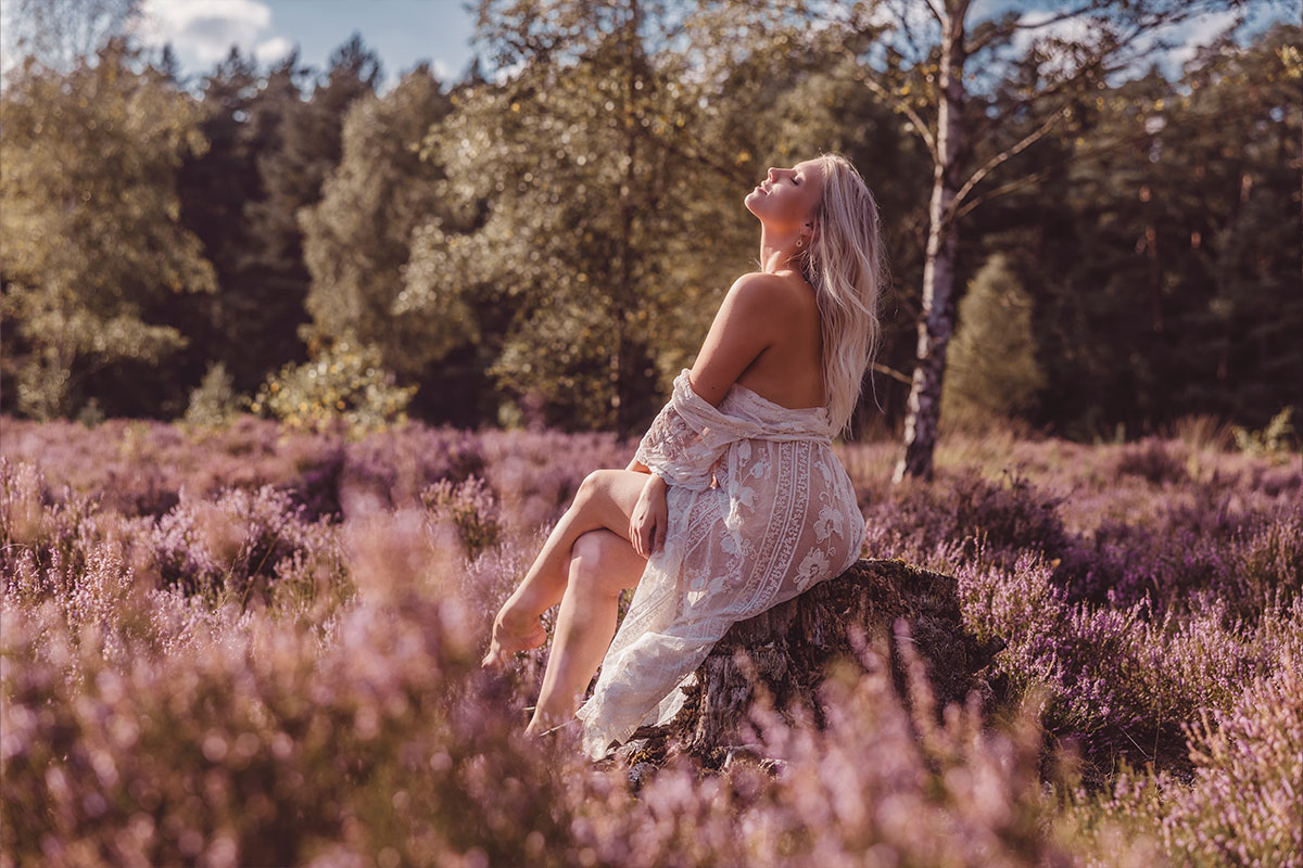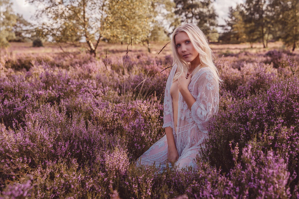 Unsere nordische Landschaft ist viel durch Wald, Moore und Heidelandschaften geprägt. Warum die dann nicht für Shootings nutzen? Im August, wenn die Heide blüht, zieht es mich besonders da hin um zu shooten. Durch Stürme werde oft viele Bäume umgeworfen. Diese knorrigen Wurzeln eignen sich hervorragend für Fotos, aber auch die farblich unterschiedlichen Moosflächen sind immer wieder gut geeignet. Bei allen Shootings in der Natur achte ich immer besonders darauf, dass wir nichts zerstören.